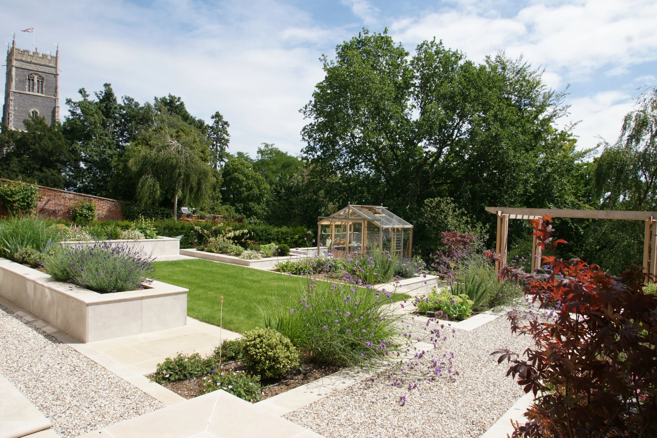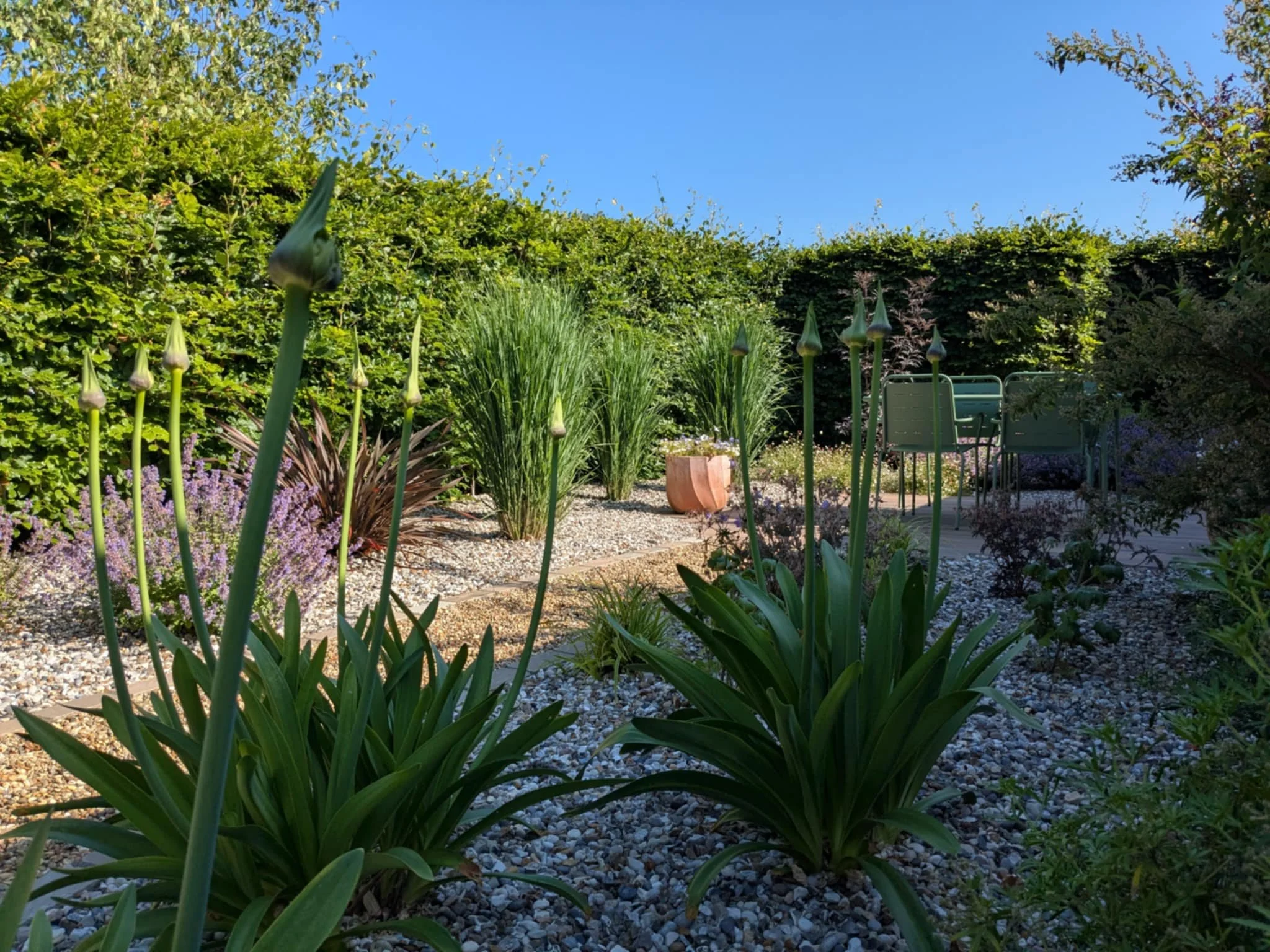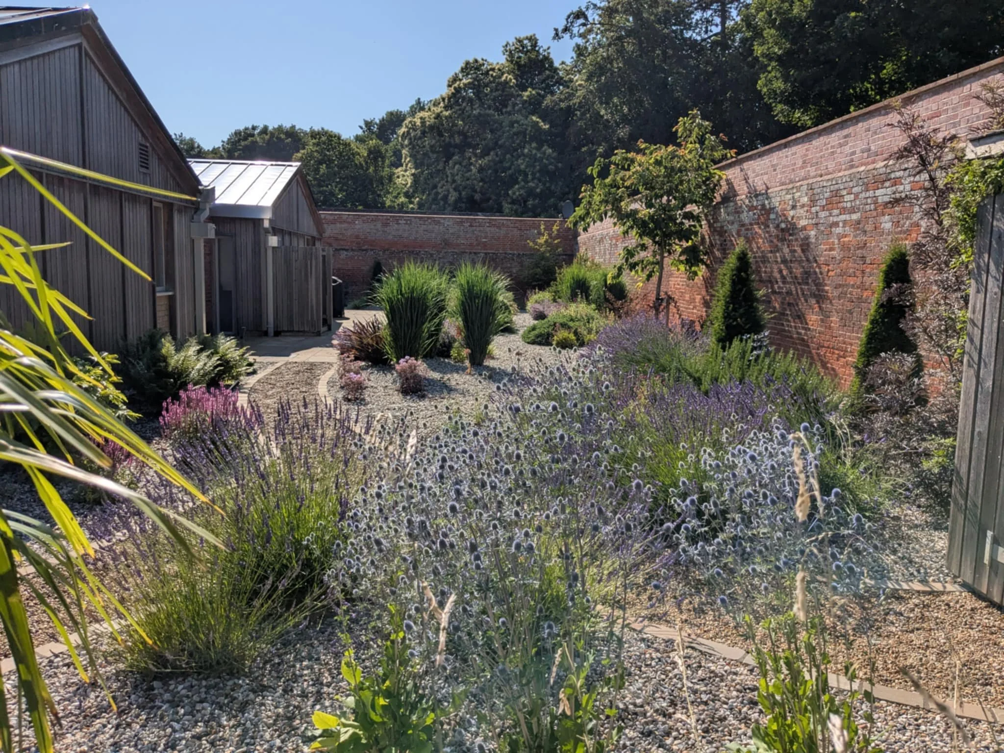 A brilliant opportunity to work with a gorgeous walled garden was too good to miss. The client fancied a gravel garden to the rear which was a bold choice and I think it worked out so well with the drama of the large victorian wall. The planting areas are expansive but due to the spacings between plantings and walkway areas the garden still feels open and inviting. The wall could not have anything fixed against it so we looked to achieve height within the garden space with tiered planting that follows a rhythm throughout the garden. Structured planting included Panicum ' Northwind', Agapanthus, Yew cones, and flowering cherry trees.