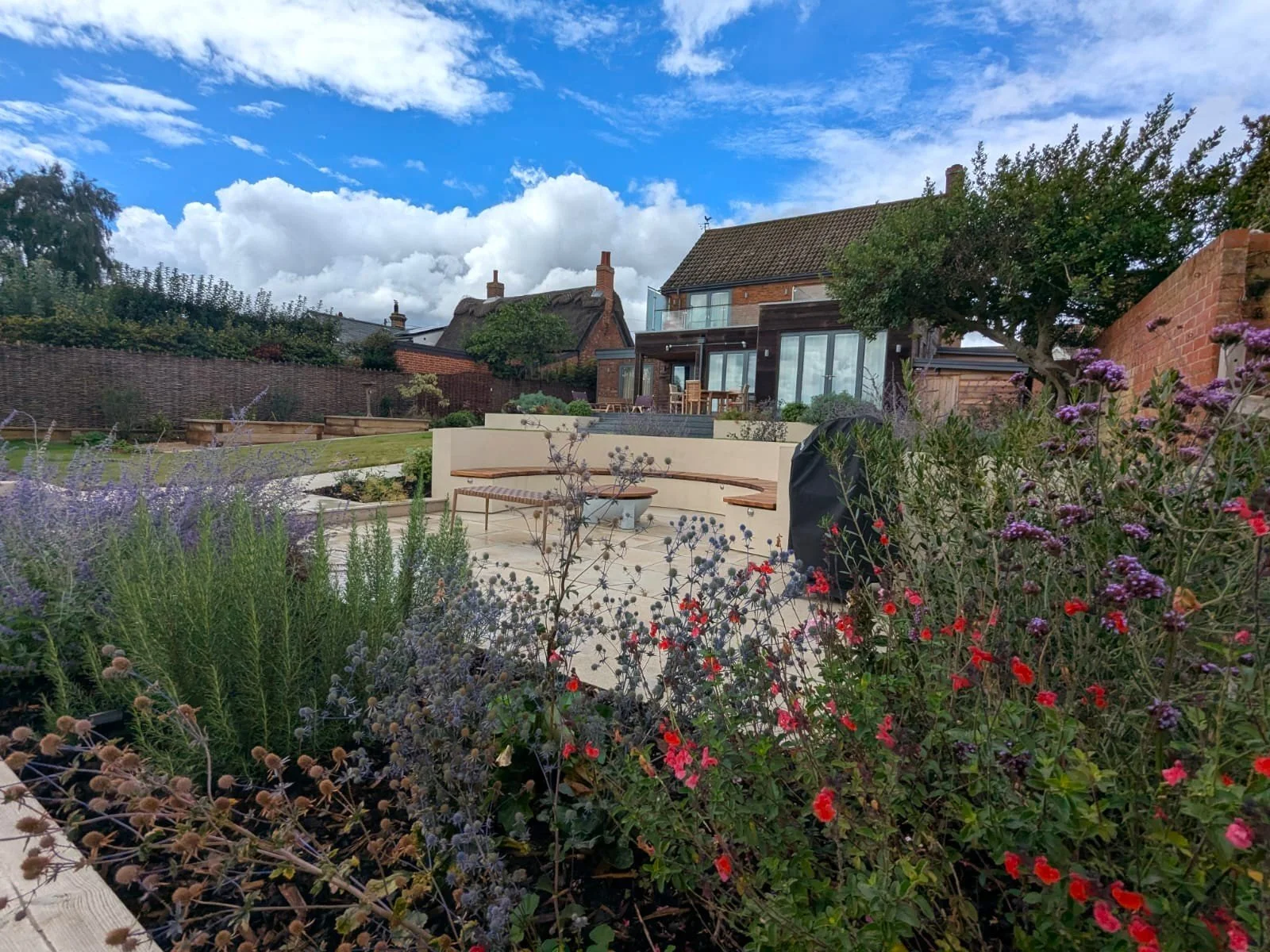 New build garden starting life as a sloped lawn, trasformed into a riot of colour and interest. The cedar fence creates amazing privacy and a beautifully warm backdrop to the colours and textures of the planting. Multiple seating opportunities are created for socialising, midday shade and quiet reading. A winding Breedon gravel path creates a feeling of space within the small area. The planting's main focus is on summer colour with Geum 'Totally Tangerine', Wallflowers and Foxgloves stealing the show.